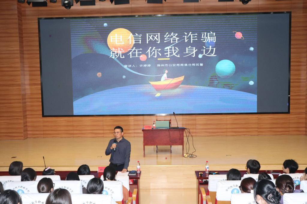为进一步提升全体师生防范电信网络诈骗的意识与能力,有效遏制校园电信网络诈骗案件发生,保障师生财产安全及校园和谐稳定,10月16日下午,护理学院在校第二学术报告厅成功举办“电信网络诈骗就在你我身边”主题防诈专题讲座。本次讲座特邀滁州市公安局南谯分局民警许婷婷主讲,学院党总支书记席民、25级新生辅导员及近200名学生代表参与活动。