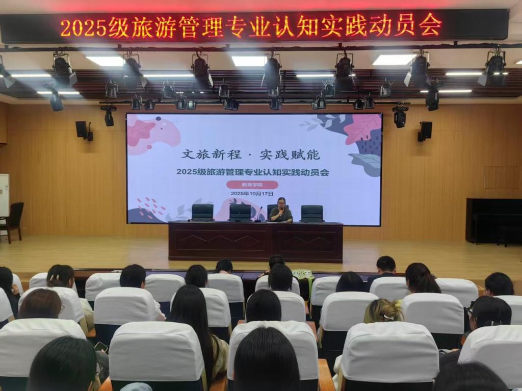 10月17日,学院在报告厅隆重举行了认知实践动员会。教育学院袁远副院长出席并作动员讲话,强调了认知实践在专业学习中的“第一课”重要性,并对同学们提出了“珍惜机会、严守纪律、学有所成”的殷切期望。旅游管理专业负责人详细解读了实践方案,从目的意义、行程安排、安全纪律等方面进行了全面部署,为实践活动的顺利开展奠定了坚实的基础。