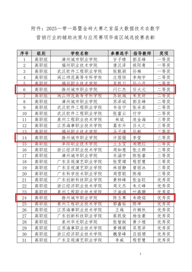 近日,2025一带一路暨金砖国家技能发展与技术创新大赛之“首届大数据技术在数字营销行业的辅助决策与应用赛项”华南区域选拔赛圆满落幕。滁州城市职业学院派出三名选手参赛,凭借扎实的专业技能和出色的现场表现,共斩获二等奖一项、三等奖一项及优秀奖一项,展现了学院在大数据技术与数字营销交叉领域的教学实力与人才培养成果。