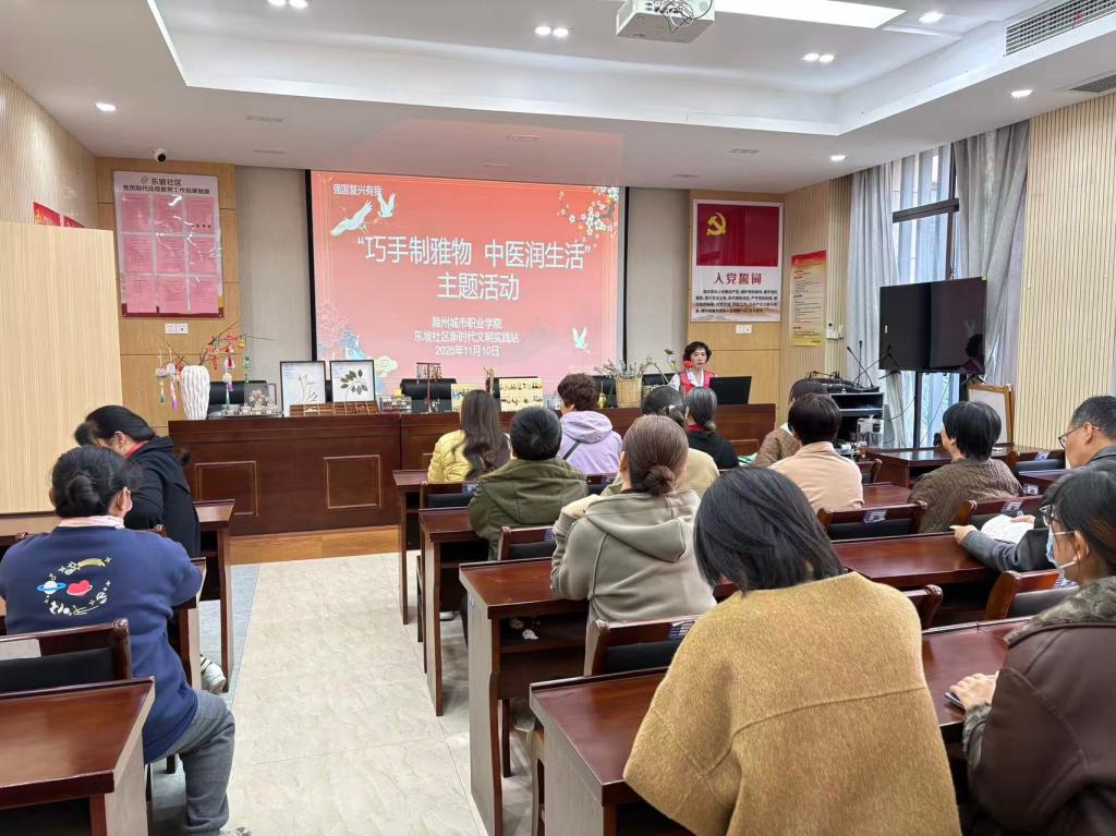 为提升中医药传播力与影响力,进一步厚植中医药文化氛围,增强群众中医药获得感与幸福感,11月10日,滁州城市职业学院生物医药学院师生团队,走进东坡社区开展“巧手制雅物,中医润生活”老有所学系列活动,让传统中医药文化在社区落地生根。