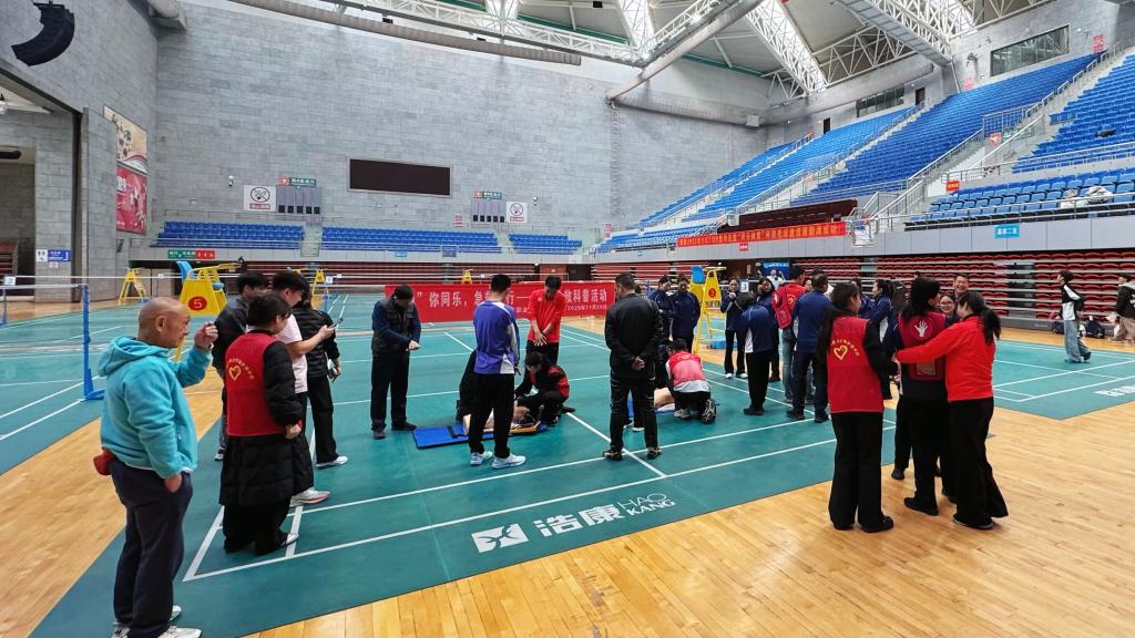 赛事中午的间隙,护理学院的师生们利用比赛休息时间,主动为在场的运动员、裁判员及工作人员组织了一场实用的急救知识科普及培训。培训内容聚焦心肺复苏(CPR)、海姆立克急救法及运动损伤包扎。通过理论讲解、标准动作示范和互动实操演练,师生们深入浅出地传授了急救要领,吸引了大量人员驻足学习并积极参与体验。此次培训不仅提升了参赛者在应对突发状况时的自救与互救能力,更将“人人学急救,急救为人人”的生命安全意识传递给了每一位在场者,成为了本次体育赛事中一道独特而富有教育意义的亮丽风景。