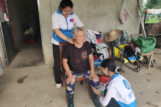 参观完试验田并协助拔草之后,志愿队前往当地留守老人家中进行义工服务。志愿队来到留守老人家中,和他们谈心,帮忙干家务。奶奶因为年轻时干农活过度劳累,身体留下许多老毛病,康复专业的学生们便给老人按摩,并根据所学的专业知识告诉她平常生活中的一些保健小知识。