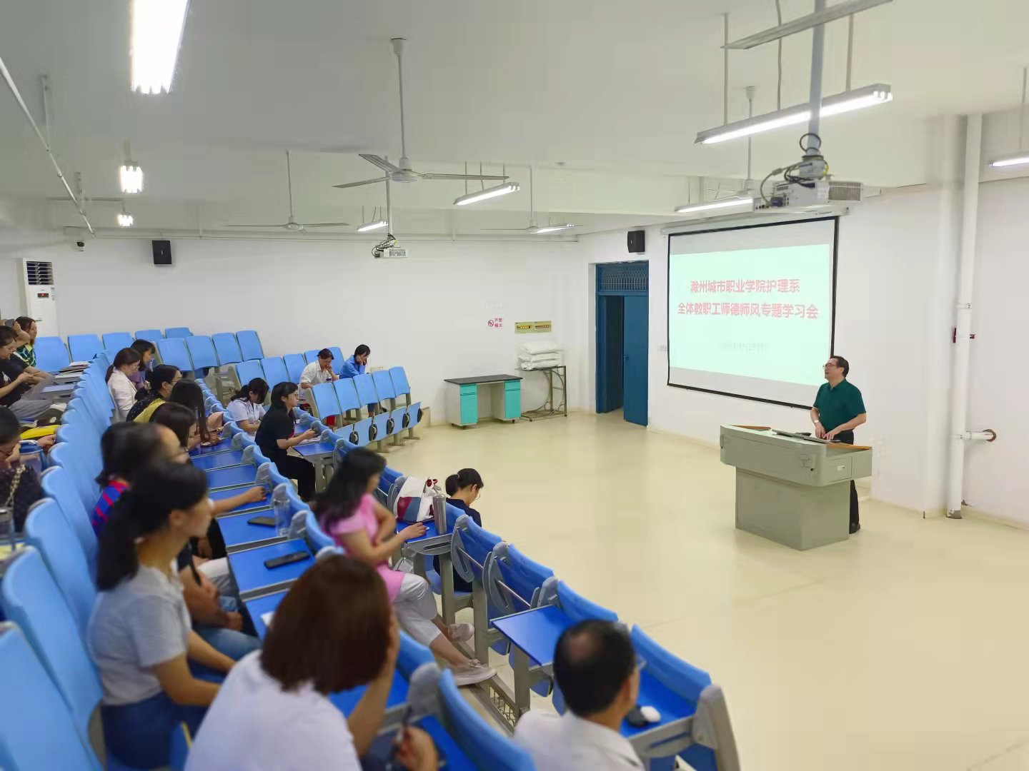 9月29日下午,护理系在B3-211召开师德师风专题学习会,学习贯彻“全省教育系统教师思想政治和师德师风建设视频推进会”精神。会议由系主任章正福主持,系全体教职工参加会议。