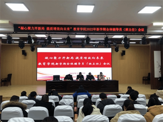 为进一步落实学生新学期返校工作,加强学生日常管理及思想教育引导工作,2月17日下午,教育学院报告厅召开了全体辅导员(班主任)工作会议。会议由院党总支副书记徐立娟主持,党总支书记钱庆兵,院长高国柱、副院长刘明辉、学管杨维懂、钟久海老师以及教育系全体辅导员(班主任)参加了会议。