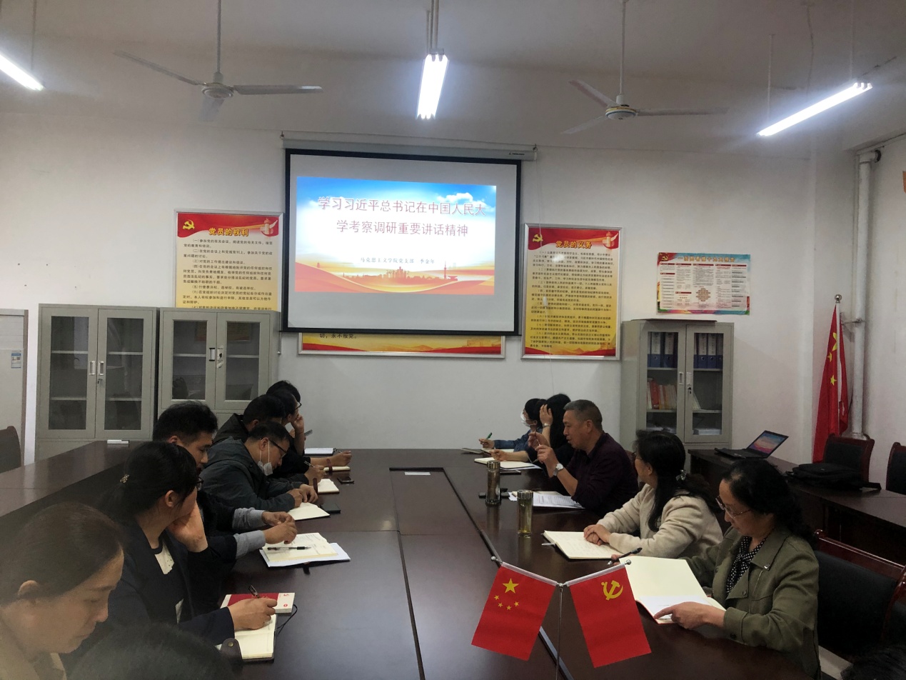 为了深入学习习近平总书记在中国人民大学考察时重要讲话精神,增强党员教师的责任感、使命感,提高党员教师的模范引领作用,5月12日,马克思主义学院党支部组织全体党员进行集中学习。会议由马克思主义学院党支部书记季金年主持,学校党委副书记牛春雨参会并指导。