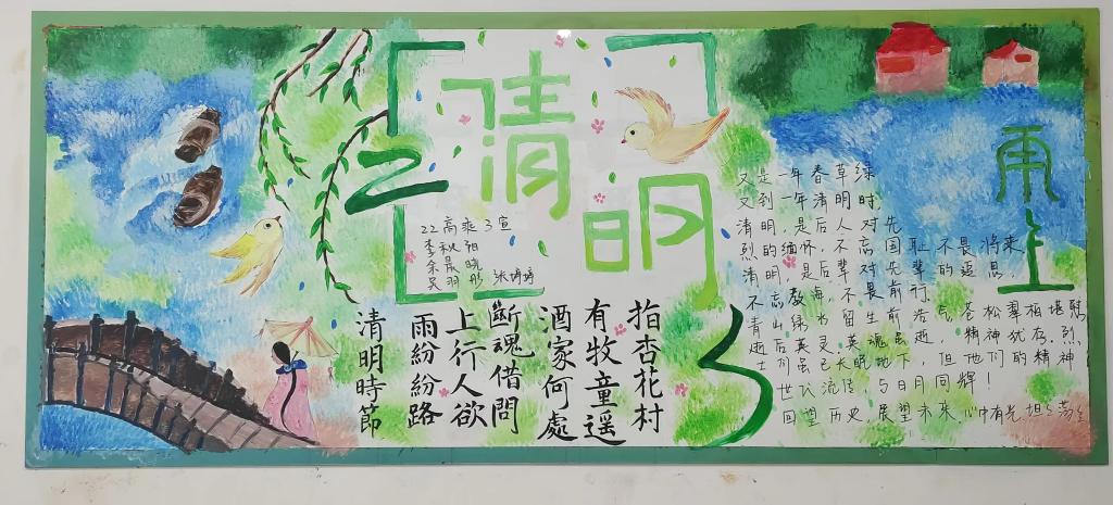 学院党总支青年委员张逍给学生开设“我们的节日·清明节”讲座,向同学们介绍了清明节的由来、有关习俗,号召同学们增强民族意识和民族凝聚力,以实际行动传承中华优秀传统文化,弘扬民族精神。各班积极响应,同学们搜集清明节的历史起源、节日习俗、诗词歌画等方面内容,设计出了内容丰富、新颖别致的清明节主题黑板报,宣传革命英烈克服万难、为崇高理想英勇献身的斗争事迹,深切感受革命先烈们坚定不移的政治信念、艰苦奋斗的优良作风和英勇无畏的革命精神。
