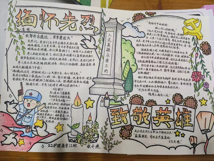 英雄之名,重逾千钧。为更好学习宣传贯彻党的二十大精神和习近平总书记关于崇尚英雄、缅怀英烈的重要论述,深切缅怀为民族独立解放、国家繁荣富强作出奉献和牺牲的英雄先烈,护理学院团总支组织开展“传承红色血脉,奋进新征程”系列主题团日活动,通过诵读英雄家书、讲述“心中的英雄”、制作手抄报以及致敬革命烈士等多种形式的主题活动,表达对革命烈士崇高的敬意和真切的缅怀。