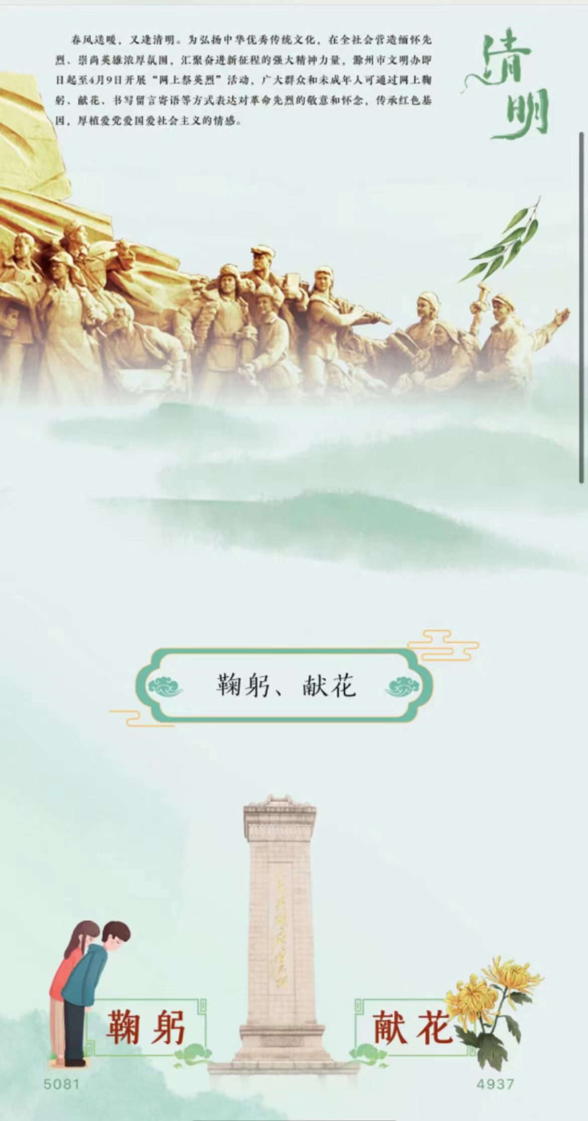 同时,护理学院团总支积极倡导同学们在清明节前后通过“中国文明网”参加网上祭英烈活动,传承红色基因,赓续红色血脉,汲取前行力量,争做新时代好青年。以网上敬献鲜花、鞠躬等方式进行祭扫,表达对革命先烈、人民英模深深的敬仰和缅怀。