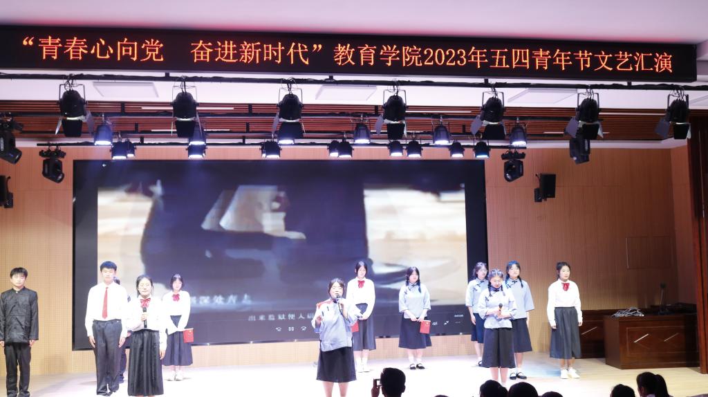 入团仪式结束后,“五四”文艺汇演在陶欣湲演唱的歌曲《骄傲的少年》中拉开序幕,随后赵雨薇演唱歌曲《一路生花》,两首歌曲都精彩展示了新时代青年的蓬勃朝气和奋发向上的精神面貌,由20小教初专3班朗诵的《错位时空》展现了青年的担当和爱国情怀,欢快优美的舞蹈《我们都是追梦人》展现了青年人的风采和对实现中国梦的期盼。