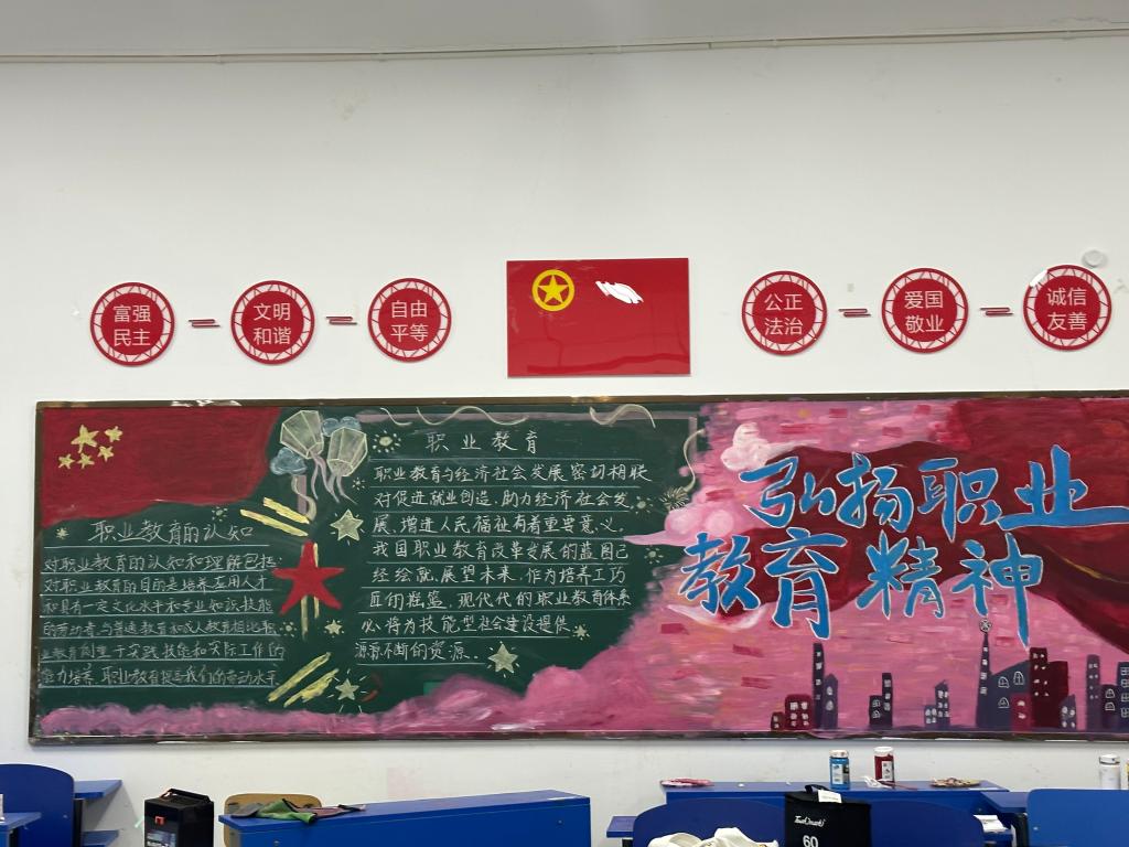 为丰富校园文化建设,营造尊重技能、崇尚技能、人人学习技能、人人享有技能的校园风尚,同时让广大同学了解职业教育、热爱职业教育,在职业教育活动周启动后,教育学院充分利用各宣传阵地,广泛开展职业教育宣传,营造了职业教育大有可为、大有作为的良好氛围。同学们创作的黑板报以图文并茂的形式呈现于创作中,形象、全面地展现了专业特色,大力弘扬工匠精神,为职业教育活动周增添了别样的色彩。