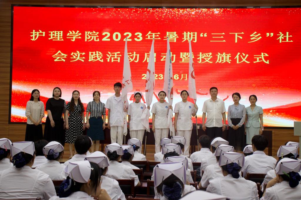 为深入学习宣传贯彻党的二十大和二十届一中、二中全会精神,引导和鼓励青年学子把课堂学习和社会实践紧密结合起来,坚定不移听党话、跟党走,上好与现实相结合的“大思政课”,6月14日下午,护理学院在校第二学术报告厅举行2023年暑期“三下乡”社会实践活动启动暨授旗仪式。校党委委员、副校长吴惠珍,护理学院党总支书记蔡季秋、院长金虹,腰铺镇梅铺社区党委书记孙林余、校团委书记陈婷婷、腰铺镇梅铺社区居委会副主任季凤、护理学院党副总支书记卢齐伟和辅导员代表、学生代表近150人参加启动仪式。仪式由护理学院团总支书记王艳主持。