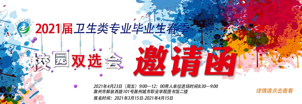 为适应高校毕业生就业工作需要,为毕业生就业提供更具针对性、更加专业化的就业指导和就业服务,滁州城市学院特举办2021届卫生类专业毕业生春季校园双选会,为做好本次活动,现将有关事项函告如下,欢迎各用人单位报名参加。
