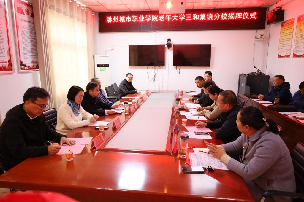 汪上代表学校党委、行政向积极帮助支持我校老年大学建设的定远县委县政府、三和集镇党委及各部门表示衷心的感谢。他指出,我校始终致力于服务地方经济社会发展,主动融入国家乡村振兴发展战略,大力推进“政校行企”深度合作,不断提升人才培养质量。在三和集镇成立滁州城市职业学院老年大学分校,是落实省委、省政府和市委、市政府“暖民心·老有所学”行动的重要举措,是推动职业教育为乡村振兴增效赋能的重要方式,更是学习宣传贯彻党的二十大精神的生动实践。