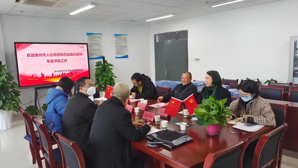 评估会在图文中心709举行。滁州城市职业学院继续教育学院院长许梅主持会议。市人社局职业能力建设科科长王华涛、滁州市人社局技能等级鉴定科胡闪闪、滁州职业技术学院继续教育学院职业培训认定科长吕波、滁州城市职业学院党委委员、校领导施向阳、继续教育学院副院长孟红军等成员参加评估会。
