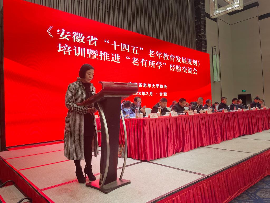 在“老有所学”经验交流会上,我校作为全省唯一的高职高专院校代表发言。会上,许梅分享了我校老年大学办学经验。我校老年大学总结为“三体现”:体现老年教育的公益性,体现服务乡村振兴,体现校地合作;“三贴近”:贴近老人不同的学习需求,贴近不同区域老人就近学习,贴近学校办学特色亮点。办学经验被安徽新闻网、《安徽日报》纸质版、《安徽日报》新闻客户端等媒体进行了报道。