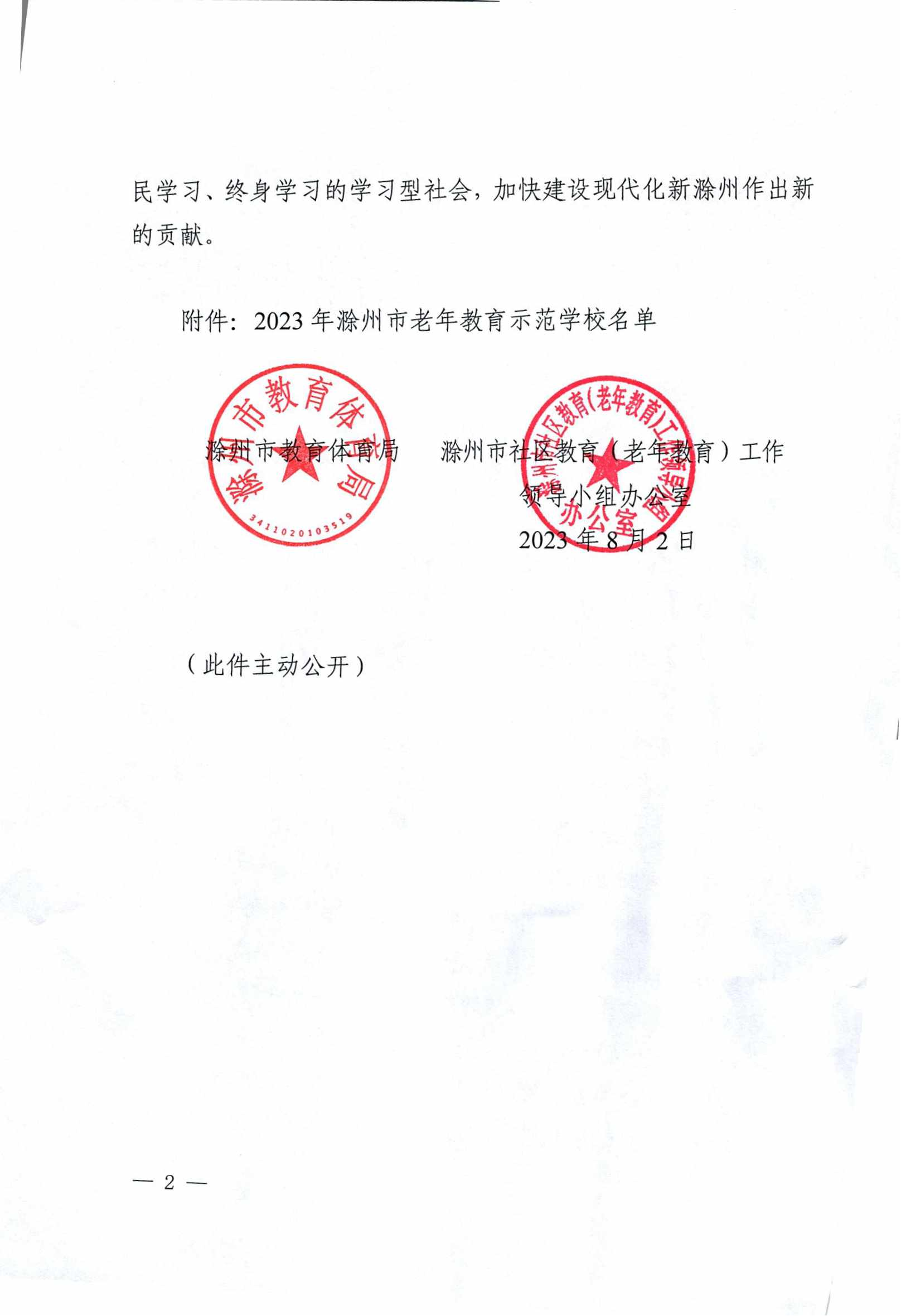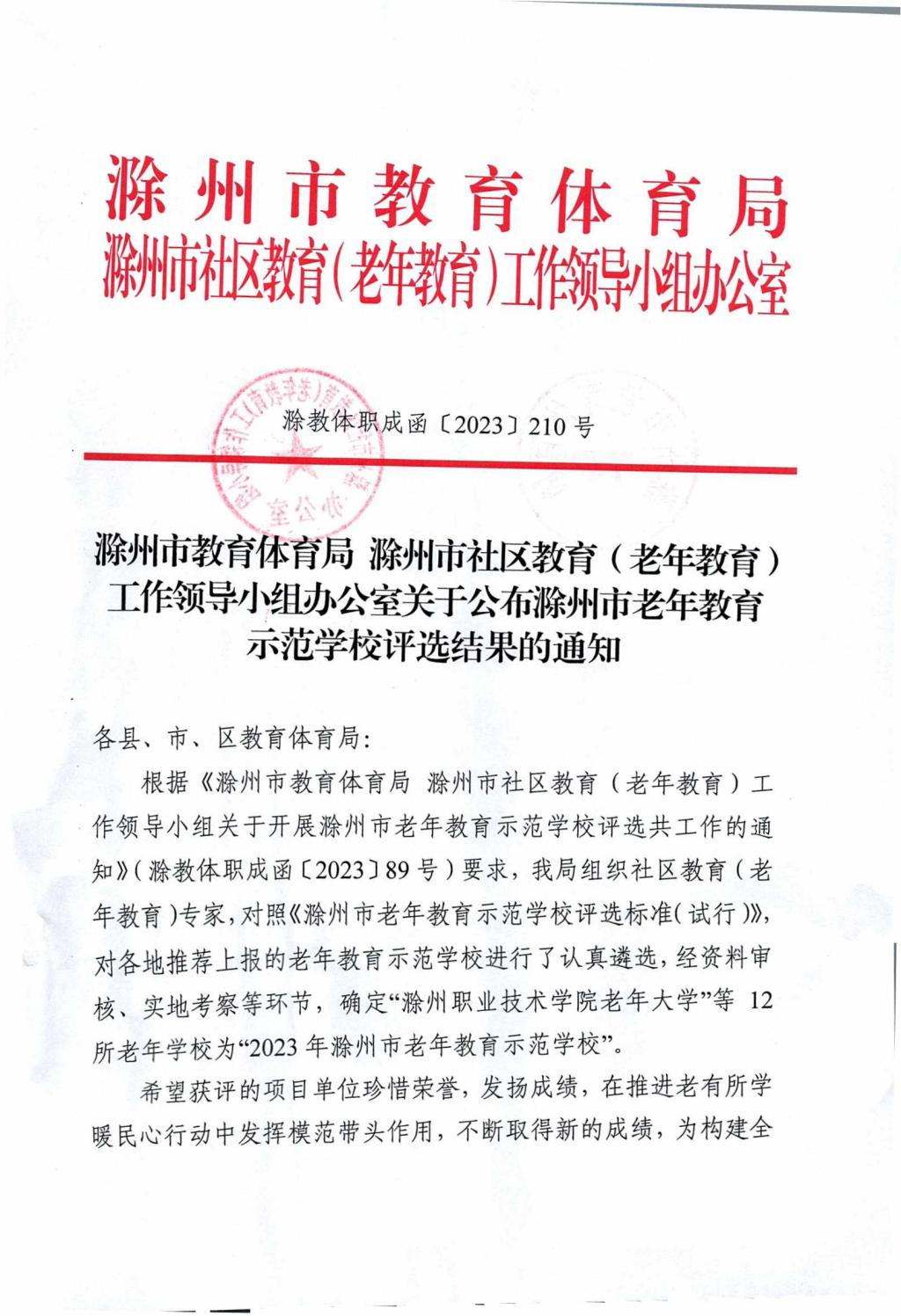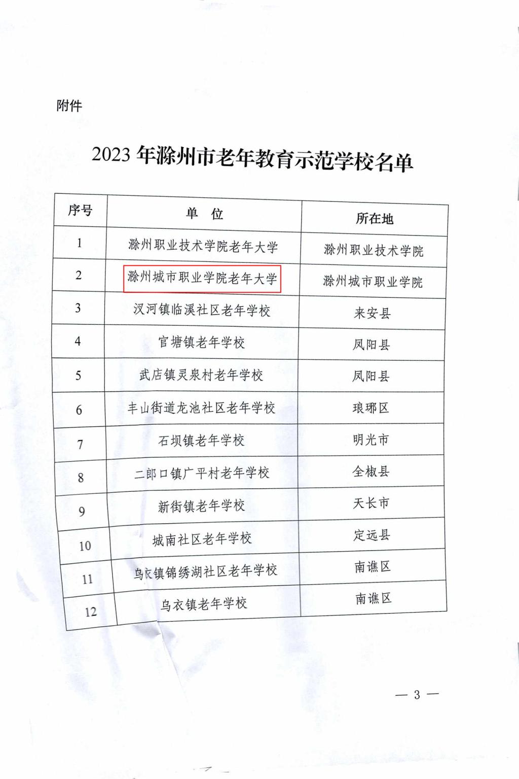 近日,滁州市教育体育局公布了“2023年滁州市老年教育示范学校”,全市共有12所学校获评,我校老年大学入选。