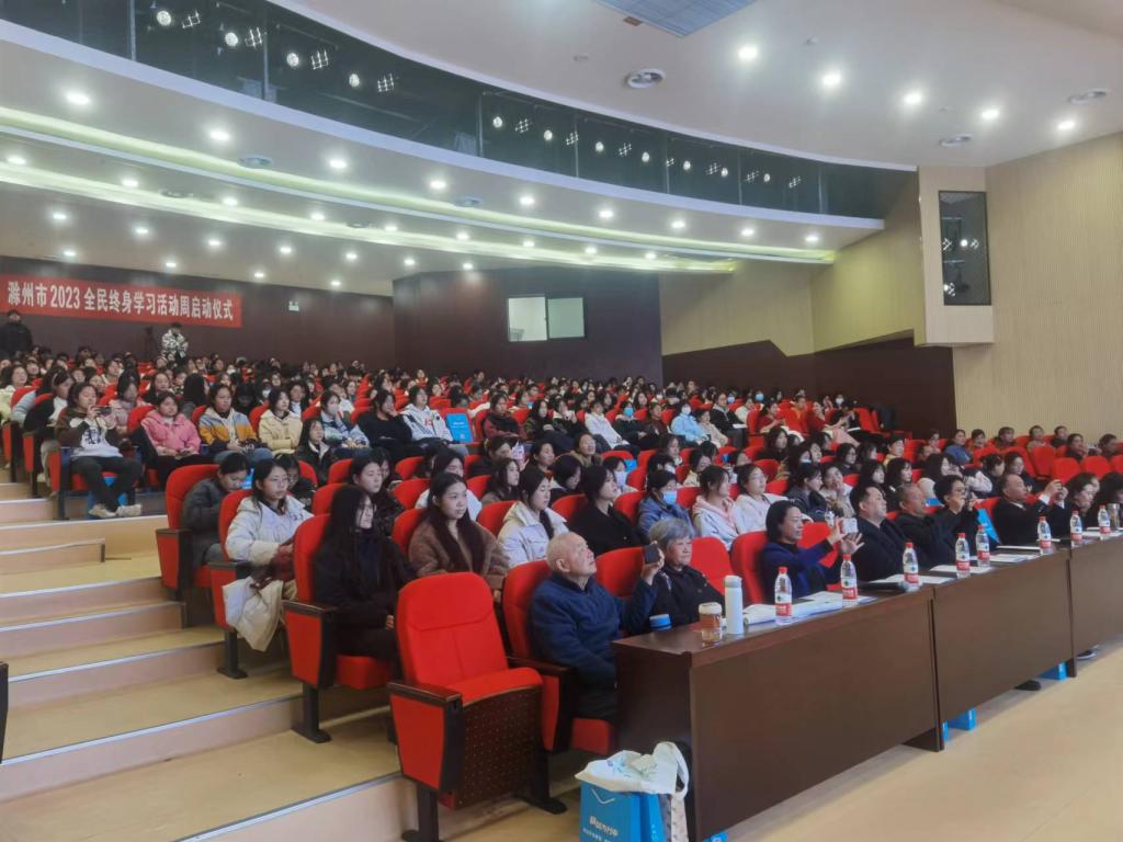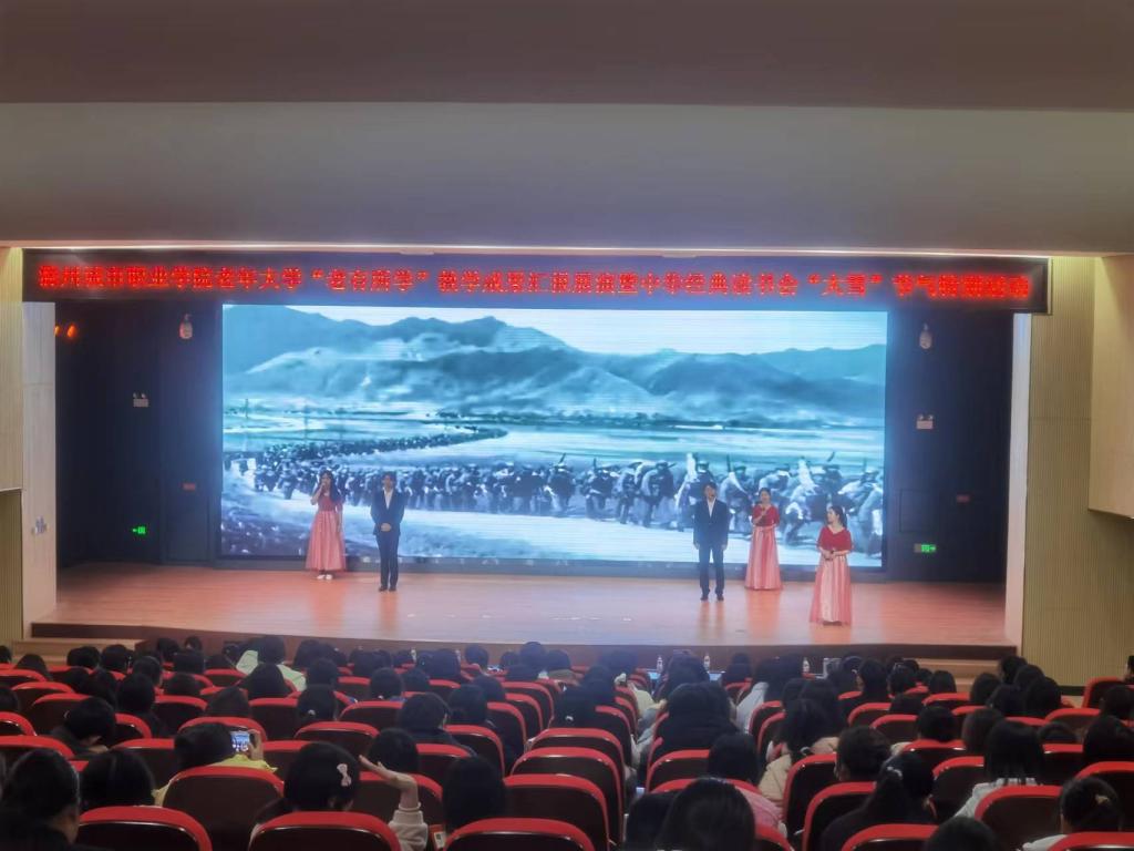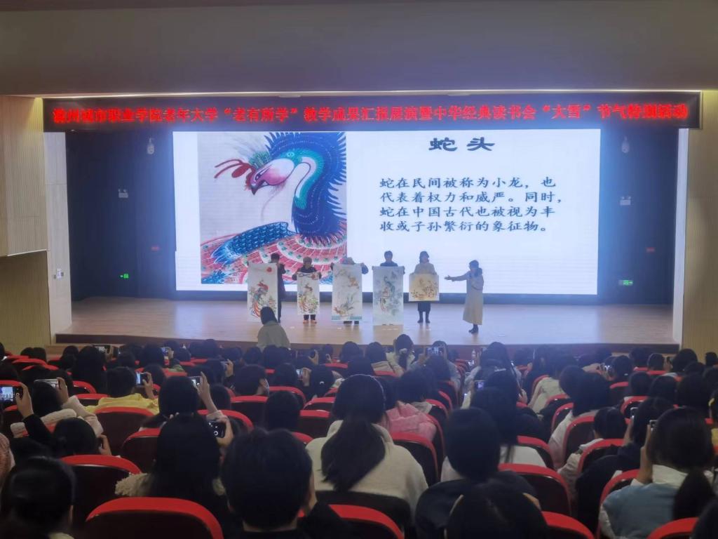 滁州城市职业学院老年大学自成立近两年来,经过校领导及师生的共同努力,今年校老年大学获得“滁州市老年教育示范学校”的荣誉称号;《坚持“三贴近 三体现”开展老有所学行动》案例在全国高校现代远程教育组主办的评选活动中荣获优秀案例奖并入选“中国老年教育优秀案例库”;校老年大学丰乐社区教学点成功当选为“2023年乡镇(街道)老年学校省级示范校”。为充分展示我校老年大学学员风采,同时弘扬中华优秀传统文化,推进“书香校园”建设,培养青年学生的阅读习惯,在学校形成爱读书、读好书、想读书的浓厚氛围,12月7日下午,在我国传统的二十四节气—“大雪”节气来临之际,宣传统战部、继续教育学院、团委共同举办校老年大学“老有所学”教学成果汇报展演暨中华经典读书会“大雪”节气特别活动。校党委委员、校老年大学校长施向阳,校党委委员、宣传统战部部长陈通,校老年大学常务副校长、继续教育学院院长许梅,团委书记陈婷婷以及中华经典读书会近400名会员参加了活动。