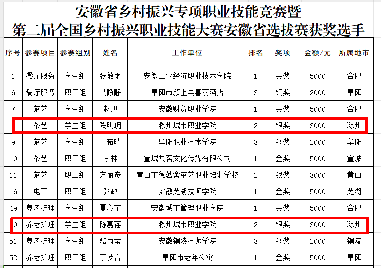 在由安徽省人力资源社会保障厅、安徽省农业农村厅(省乡村振兴局)主办的安徽省乡村振兴专项职业技能竞赛暨第二届全国乡村振兴职业技能大赛安徽省选拔赛中,继续教育学院协助滁州市人社局,积极选拔、组织我校学生参赛,最终管理与信息学院陶明玥同学、护理学院陈慕荏同学分别在茶艺项目(学生组)、养老护理项目(学生组)中获得银奖,祝贺!