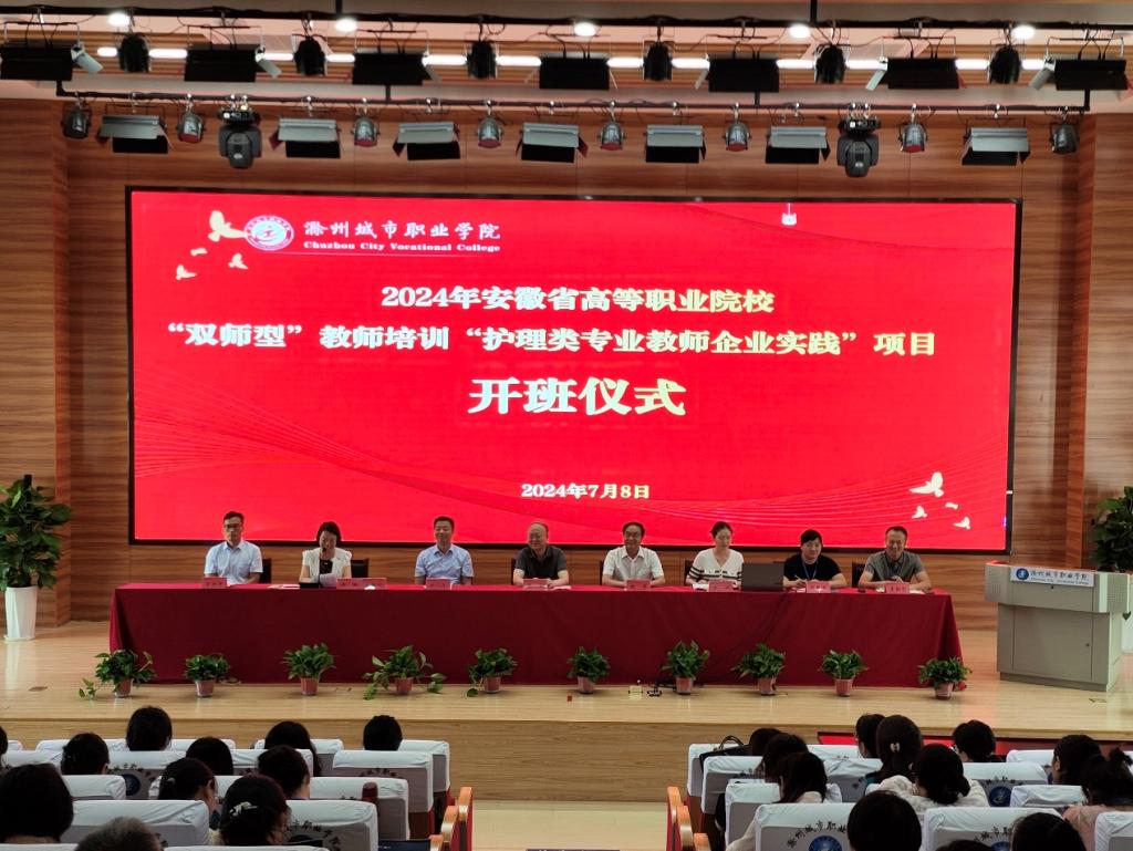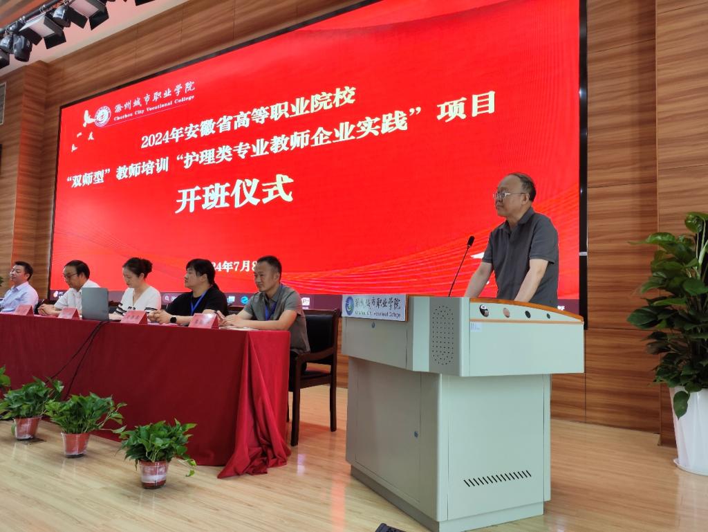 为贯彻落实《教育部等四部门关于印发<深化新时代职业教育“双师型”教师队伍建设改革实施方案>的通知》精神,深化职业院校教师队伍建设改革,培养造就高素质“双师型”教师队伍,由安徽省教育厅高等学校师资培训中心主办、滁州城市职业学院承办的2024年安徽省高等职业院校“双师型”教师培训“护理类专业教师企业实践”项目培训班,于7月8日上午在护理学院报告厅举行开班仪式。安徽省高等学校师资培训中心副主任张韬,安徽师范大学马克思主义学院教授、博士生导师赵平,我校党委副书记、校长汪上,护理学院院长金虹,继续教育学院院长许梅等出席开班仪式,来自全省18个院校的57名参训教师参加了仪式,开班仪式由许梅主持。