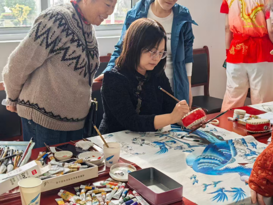 接下来是老年大学非遗课程教学及成果展演环节。刘晓玲、毛丽芳、王静、吴凤梅四位老师先后带来了凤画、凤阳花鼓、剪纸、舞龙等非遗课程教学。授课老师们将理论讲授和实践操作相结合,语言生动活泼,指导细致入微,充分带动了老年学员们的主动性与积极性,互动式教学方式让现场的学习气氛非常热烈。