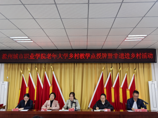 为深入贯彻落实省委组织部等八部门《关于推进老年教育向基层延伸的若干意见》,加快推进我市老年教育向基层延伸,11月13日,“滁州城市职业学院老年大学乡村教学点授牌仪式暨非遗进乡村”活动在大陈村村委会隆重举行。滁州城市职业学院党委委员、副校长吴惠珍,三和集镇党委副书记、镇长黄远征,滁州城市职业学院继续教育学院院长、校老年大学常务副校长许梅等领导出席仪式,三和集镇各村主要负责同志、非遗团队师生及老年大学学员代表参加活动。仪式由大陈村驻村工作队队长、第一书记王旭主持。