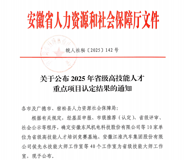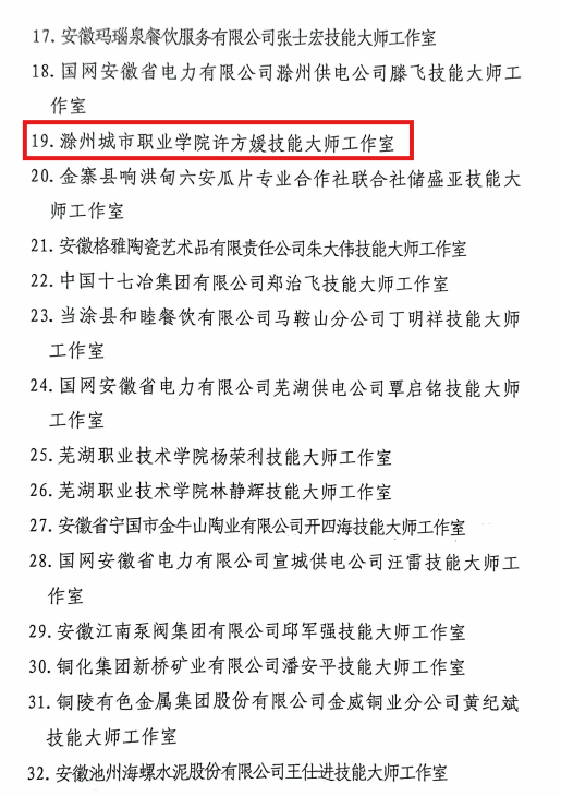 8月25日安徽省人力资源和社会保障厅发布了《关于公布2025年省级高技能人才重点项目认定结果的通知》(皖人社秘〔2025〕142号),我校许方媛大师技能工作室成功入选2025年省级技能大师工作室名单。祝贺!