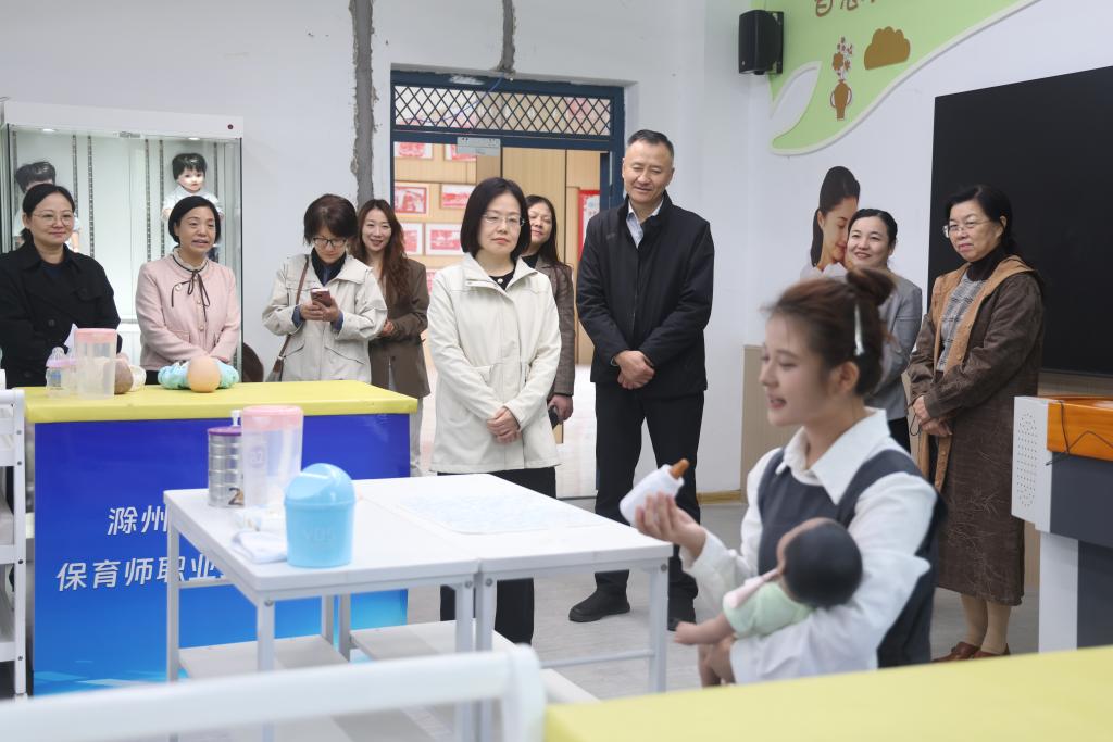 调研伊始,董志慧副主席一行在校领导的陪同下,首先实地考察了教育学院的幼儿照护实训室。调研组细致观摩了幼儿照护的实践教学过程,对学校在相关领域扎实的实训条件与学生培养工作给予了肯定。
