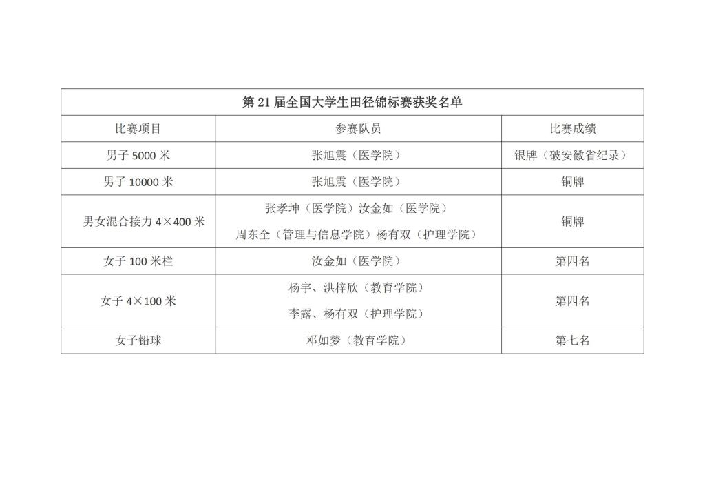8月15日晚在经历了6天的激烈角逐后第21届全国大学生田径锦标赛在安徽职业技术学院圆满落幕。在本次大赛中,我校派出了由张瑞全、乔黎、许辉等老师为教练,张旭震、周东全、杨有双等10名男女运动员组成的参赛阵容。经过六个比赛日紧张而激烈的角逐,我校代表队最终获得银牌一枚、铜牌两枚、打破省纪录一项、三名同学达到国家二级运动员水平、团体总分42分列全国第七名及女子团体总分第七名的优异成绩。我校田径代表队被大赛组委会授予“体育道德风尚奖”荣誉称号!热烈祝贺!