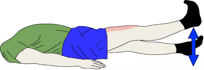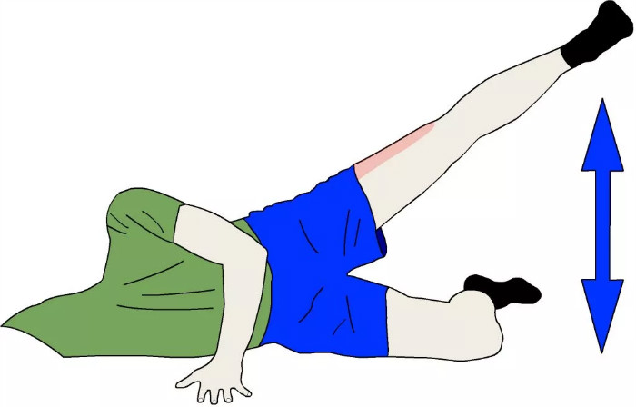操作:拧紧你的大腿肌肉,慢慢地将受伤的腿从地板上抬起四次。保持腿向上两次计数,然后降低腿四次计数。放松你的大腿肌肉。拧紧大腿,重复。不要向上推臀部;他们必须一直在地板上。