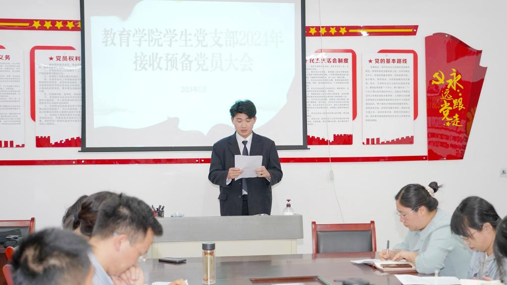为进一步加强支部党组织建设,推进支部党员发展工作,教育学院学生党支部于5月13日在恩镇楼411会议室召开了接收预备党员大会,会议讨论了吸收孙浩然等11名发展对象为支部预备党员的事宜。会议由学生党支部副书记杨维懂主持,支部全体党员、入党介绍人参加了此次会议。会议伊始,学生党支部书记陈立超致开幕词,他强调了预备党员接收大会的重要性,并对即将加入的新成员表示热烈欢迎。会议严格按照党组织接收预备党员程序,杨维...