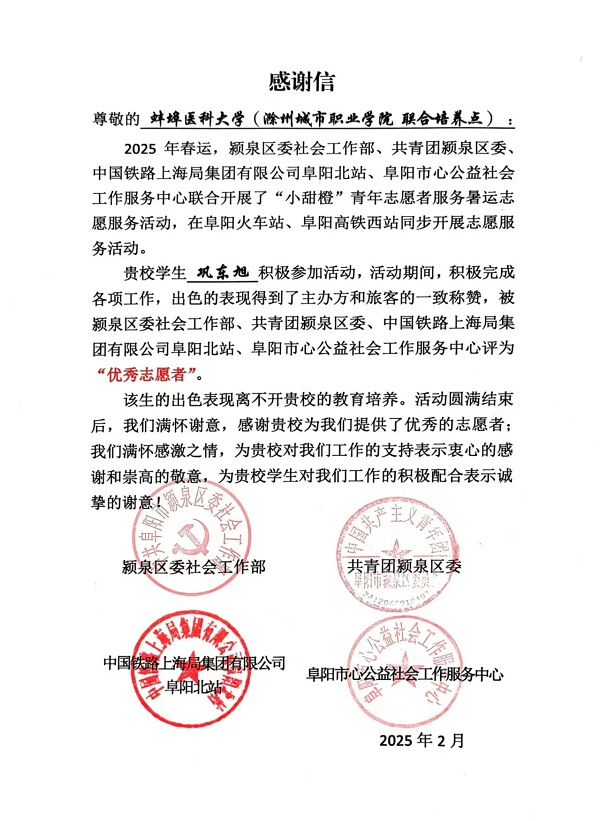 近日,共青团阜阳市颍泉区委社会工作部、共青团颍泉区委、中国铁路上海局集团有限公司、阜阳市公益社会工作服务中心联合向我校发来感谢信,对我校医学院巩东旭同学在阜阳市颍泉区各基层单位参加2025年寒假“返家乡”社会实践活动的突出表现表示肯定与赞扬,对我校的支持表达感谢。信中指出,巩东旭同学作为返乡大学生,积极参加大学生寒假“返家乡”社会实践活动,在阜阳火车站、阜阳高铁西站及当地社区等工作中表现出色,得到...