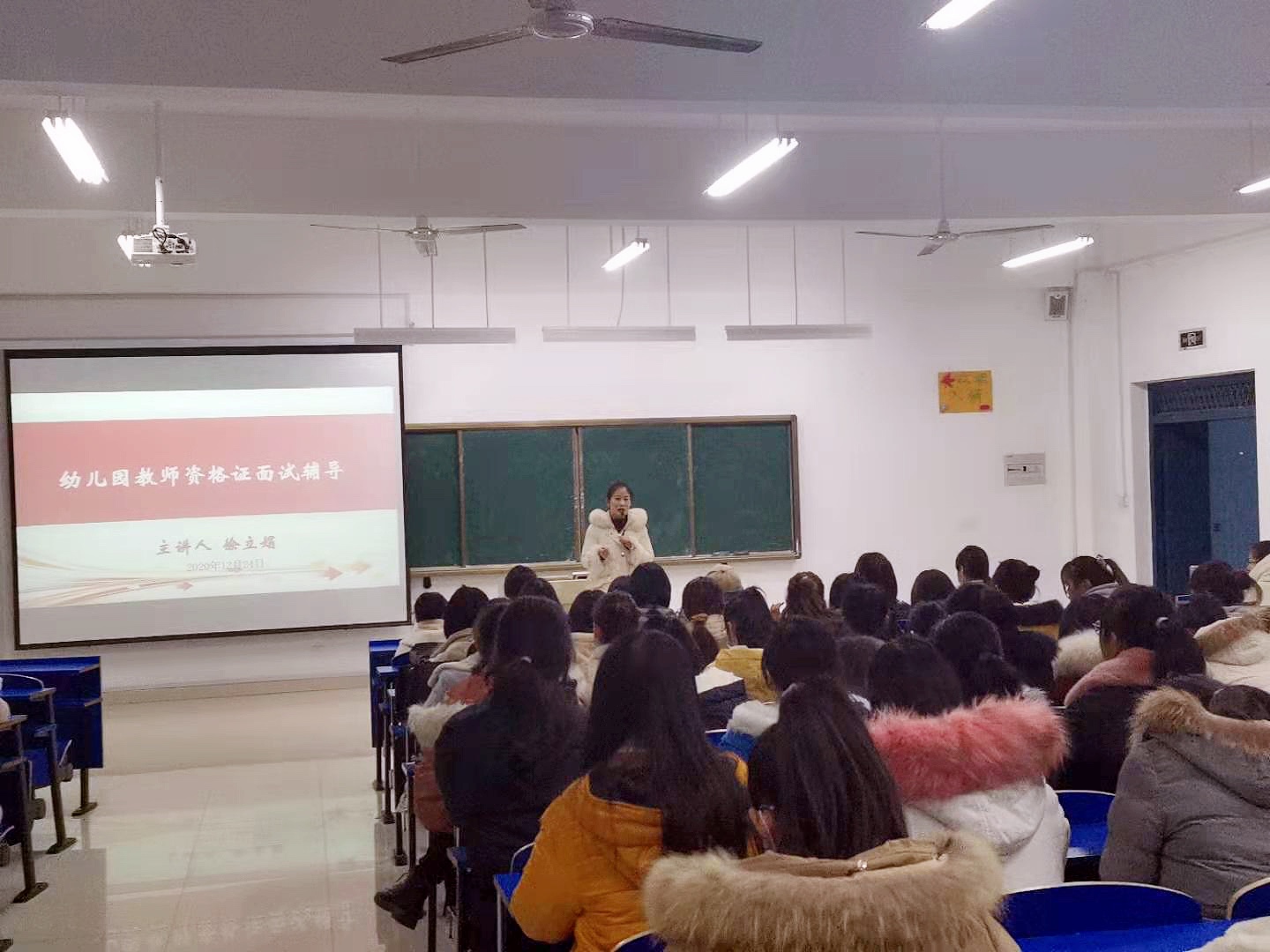 12月24日下午,教育系在C1南1104公共教室举办幼儿园教师资格证面试辅导讲座,教育系副书记徐立娟应邀担任主讲。2018级学前教育专业(高专)、2016级学前教育专业(初专)及2018级早教专业13个班级200余人参加了此次讲...