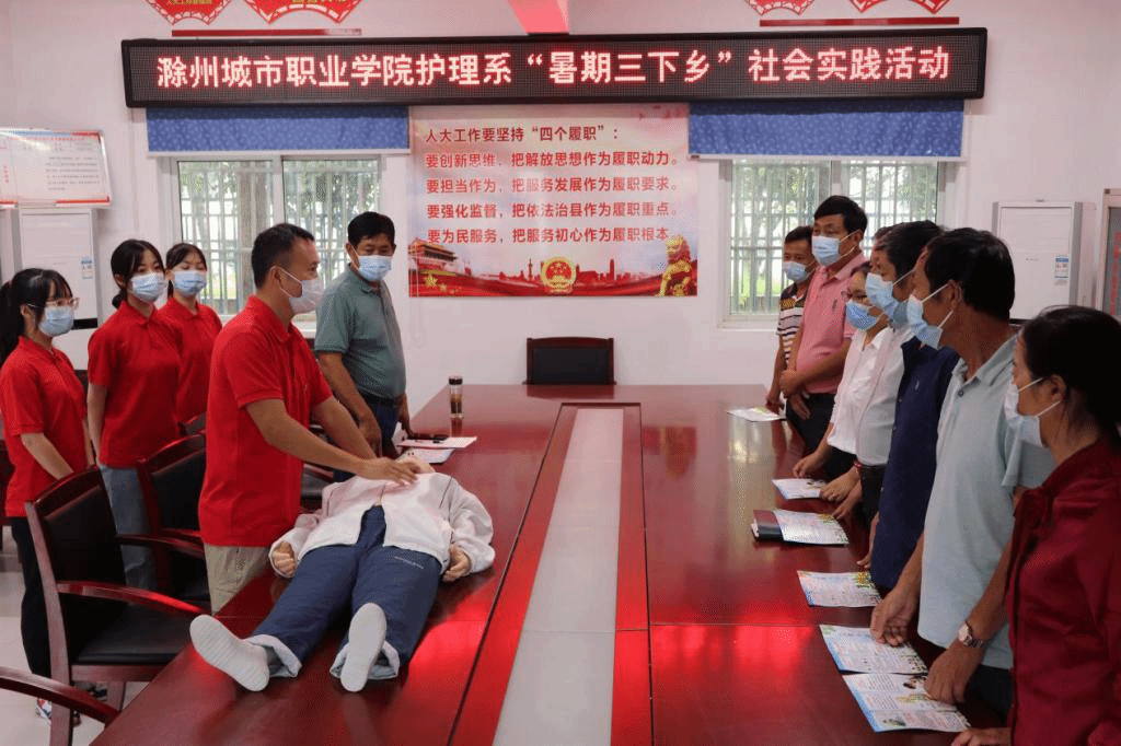 为助力乡村振兴,丰富大学生的暑期生活,提升大学生服务意识,进一步提高广大群众的防灾避险、自救互救能力,滁州城市职业学院护理系大学生暑期“三下乡”社会实践团队在全椒县大墅镇开展了“急救知识我普及”宣传培训活动。本次培训的内容主要包括心肺复苏和海姆立克急救法。培训老师李勋华先是深入浅出地讲解心肺复苏法的操作要领,以及气道异物梗阻对于成人、儿童以及婴儿应采取的急救方法,并利用模型为大家进行示范和教学...