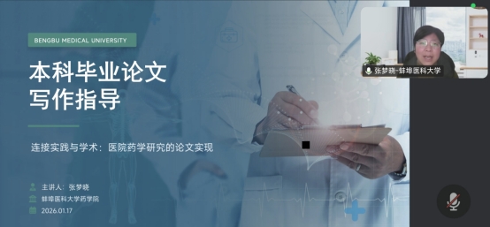 1月17日上午,蚌埠医科大学药学院教科研办主任张梦晓通过线上平台,为滁州城市职业学院药学系教师及24级药学本科班学生作题为“连接实践与学术:医院药学研究的论文实现”的毕业论文写作指导讲座。讲座围绕毕业论文的意义、方法与规范展开,旨在提升学生的学术实践与综合研究能力。张梦晓系统阐述了毕业论文在药学本科培养中的核心作用,强调其是衔接理论与临床的关键桥梁。她结合专业实际,重点推荐“医院药学实践型论文”作为...
