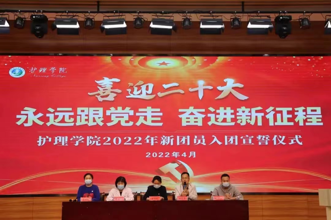 为喜迎党的二十大,弘扬“五四运动”精神,引导广大团员青年更好地发挥先锋模范带头作用,在即将迎来中国共青团成立100周年之际,4月27日下午,护理学院在第二学术报告厅举行2022年新团员入团宣誓仪式,护理学院党总支书记蔡季秋,党总支委员、副院长、教工党支部书记左晶晶,党总支委员、组织员、学生党支部书记李勋华,学管老师张莹莹参加活动,22名新团员和团学干部代表近50人参加宣誓仪式。仪式由党总支副书记朱启来主持。仪...