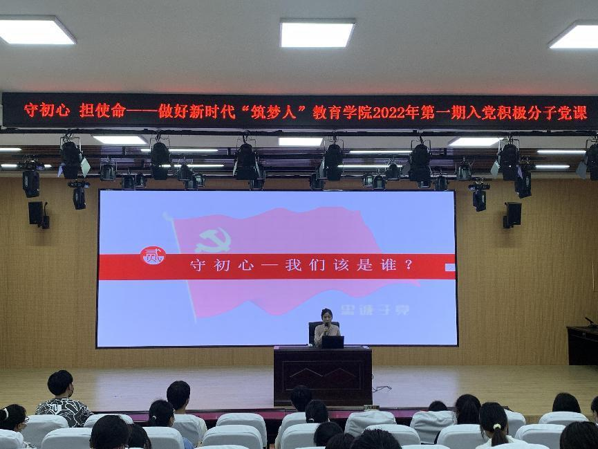 为深入推进党史学习教育,强化党员发展工作,加强入党积极分子队伍建设。2022年4月26日下午4时40分,教育学院分党校在教育学院报告厅及C1南2203通过现场和直播的方式举办2022年第一期培训班第三讲。教育学院党总支副书记徐立娟带来主题为“守初心担使命—做好新时代‘筑梦人’”的专题党课。徐立娟以习近平总书记在党的十九大开幕会讲话为引入,从寻初心、守初心、担使命三部分展开,激励入党积极分子勿忘昨日苦难辉煌,无愧今...