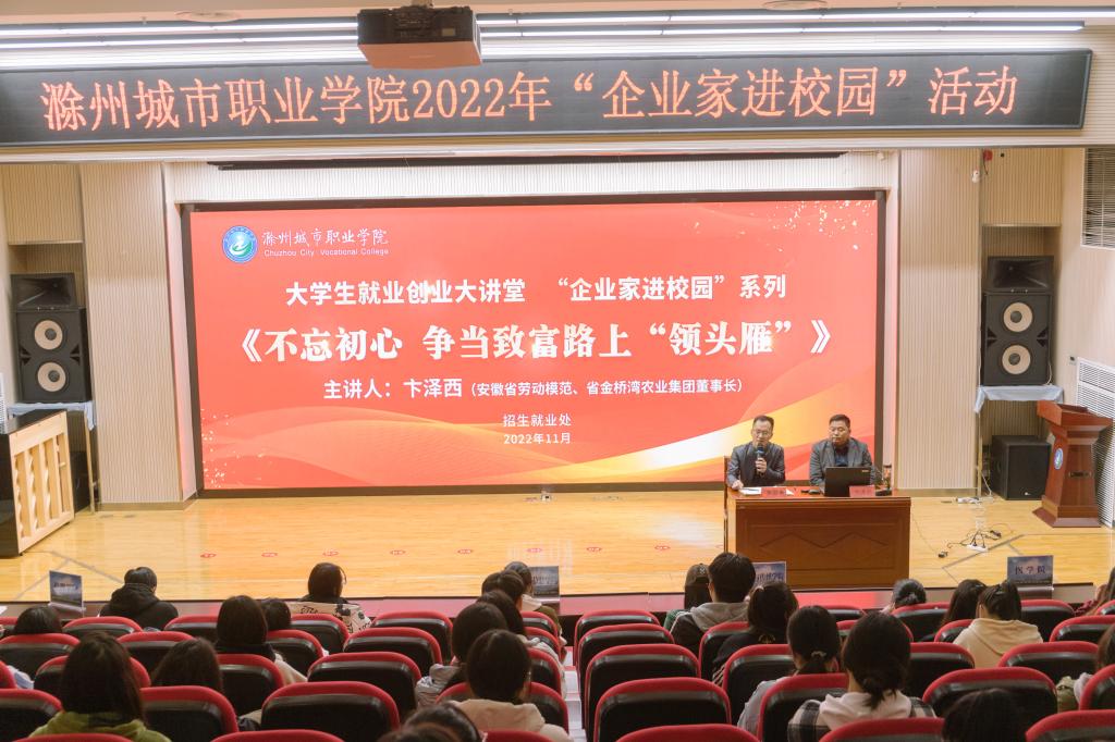 为激发大学生创业热情,提高创新创业能力,促进更高质量就业,11月23日下午,我校在图文中心四楼报告厅举办大学生就业创业大讲堂,开展“企业家进校园”活动。活动邀请2022年安徽省劳动模范、省第十一次党代会代表、省金桥湾农业集团董事长卞泽西宣讲创业故事。来自各学院学生代表近150人聆听了讲座。活动由招生就业处处长朱启来主持。会前,校党委书记张志华在接待室亲切会见了卞泽西先生。她听取了企业发展情况汇报,并详细了...