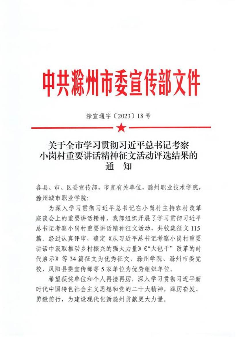 近日,滁州市委宣传部组织开展的全市学习贯彻习近平总书记考察小岗村重要讲话精神征文活动评选结果公布,此次征文活动,共收集征文115篇。经过认真评审,确定《从习近平总书记考察小岗村重要讲话中汲取推动乡村振兴的强大力量》《“大包干”改革的时代启示》等34篇征文为优秀征文,其中,我院教师蒋倩倩以征文《弘扬小岗精神 助力乡村振兴》荣获三等奖。祝贺!获奖文章《弘扬小岗精神 助力乡村振兴》通过分析小岗精神的三大内核...