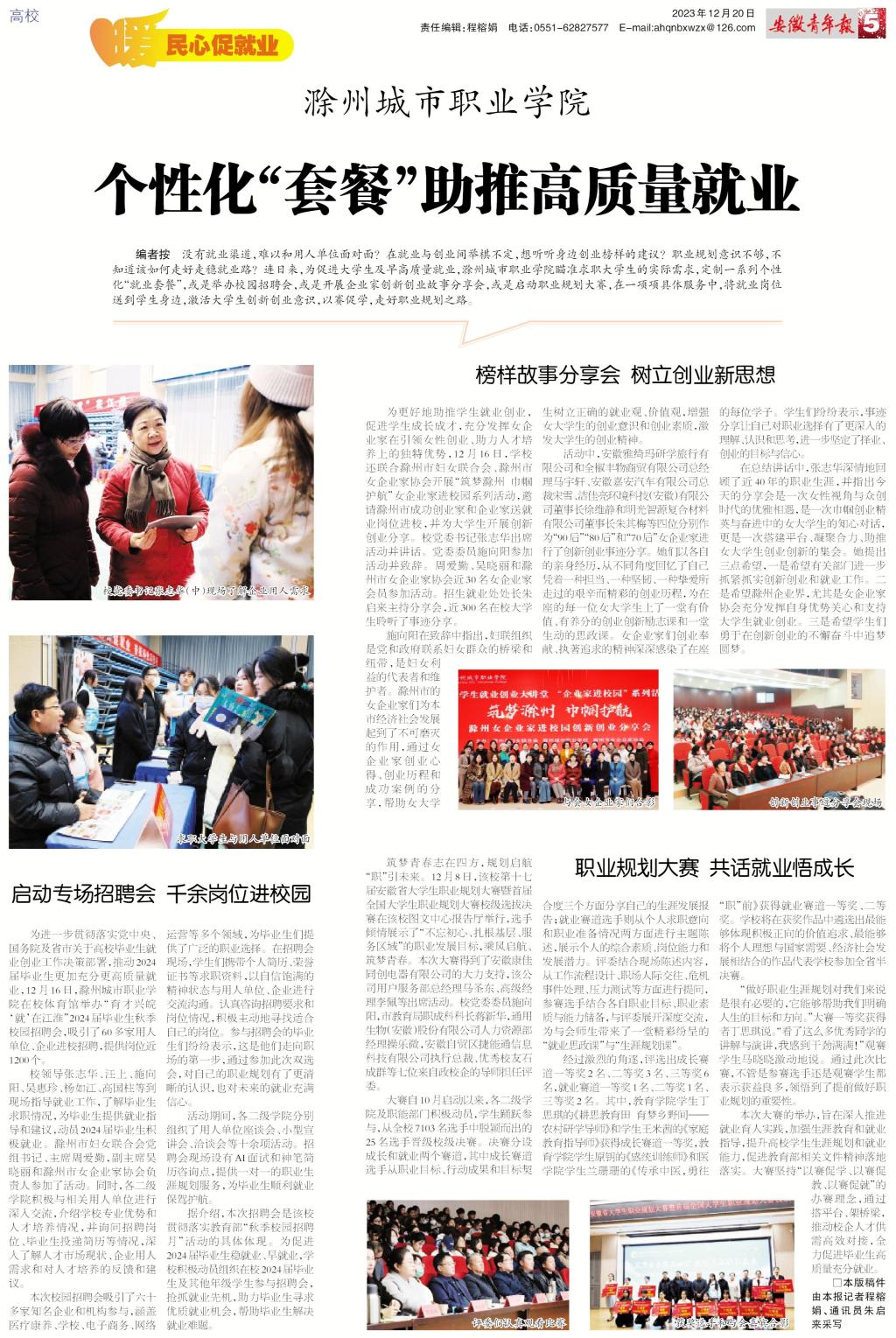 《安徽青年报》整版报道:滁州城市职业学院:个性化“套餐”助推高质量就业