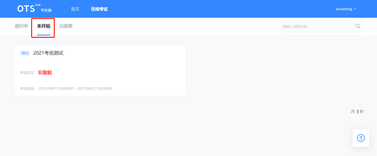 (2)点击在线考试,未开始,可以看到将要进行的考试。
