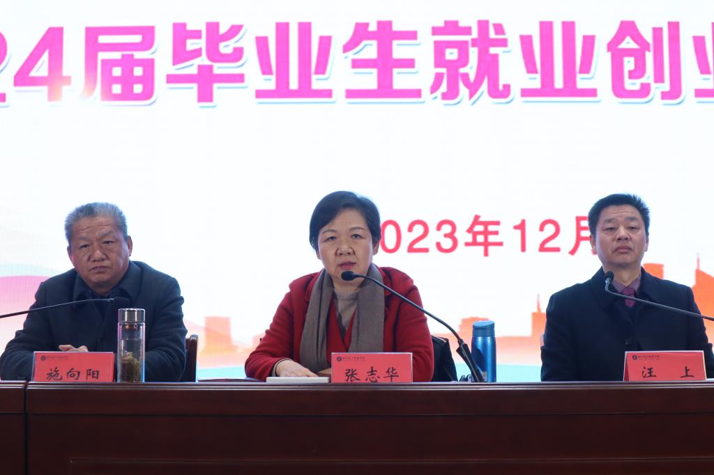 为深入贯彻党的二十大精神,落实党中央、国务院“稳就业”“保就业”决策部署,全力以赴促进2024届毕业生更加充分更高质量就业,12月20日下午,学校召开2023届毕业生就业创业工作总结暨2024届毕业生就业创业工作启动会。党委书记张志华出席会议并讲话。党委副书记、校长汪上主持会议。校领导施向阳、曹士东、吴惠珍、陈通、杨如江、高国柱参加会议。